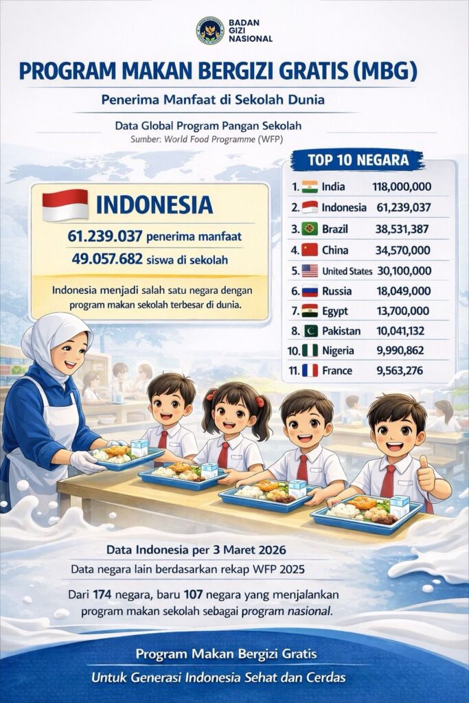 republiktv,- Program Makan Bergizi Gratis (MBG) yang dijalankan pemerintah melalui Badan Gizi Nasional (BGN) menempatkan Indonesia sebagai salah satu negara dengan program makan sekolah terbesar di dunia. Berdasarkan data yang dirilis per 3 Maret 2026, jumlah penerima manfaat program ini telah mencapai 61.239.037 orang, dengan 49.057.682 di antaranya merupakan siswa sekolah.
